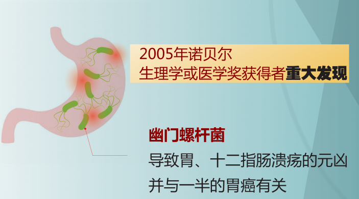 發現幽門螺杆菌的2名澳大利亞醫學家獲得2005年諾貝爾生理學或醫學獎。他們在慢性胃炎患者的胃黏膜組織切片上觀察到幽門螺杆菌,并且發現這種細菌鄰近的胃黏膜總是有炎症存在。在廣泛而深入的研究中,他們發現這種細菌是導緻胃、十二指腸潰瘍的元兇,并與一半的胃癌有關。